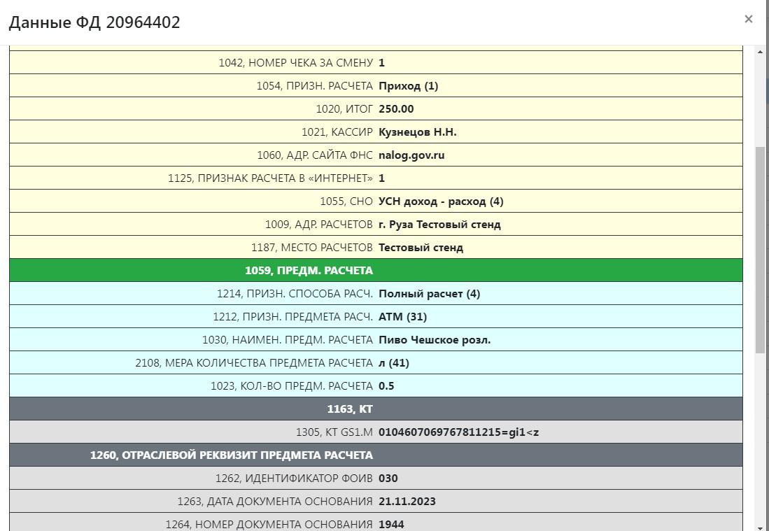 А какие теги Вы хотите в ОФД увидеть? См. (65), там верно написано. А 1125 и 1234 - от передачи из кассового софта зависят. Тут прошивку/драйвер обновляй/не обновляй - если их нет на уровне программы, то и в ОФД не будет. Кстати, 1234, как я понял и без интегрированного терминала не сформировать, откуда программа узнает, что там на автономном, не подключенном. PS Сейчас проверил, и 1125 в ОФД нет. Ну, он с 0 по любому, так, как это не интернет магазин, а обычный. Но, он тоже есть в уведомлении в ЧЗ: "internetPayment": 0 Странно, я думал, что он все-таки в чеке должен быть, но нет. В чеке, по крайней мере 1-ОФД его не показывает. Не знаю, на сколько это правильно. PSS Похоже правильно, так, как в тестовом ОФД где уведомления отображаются, он тоже в уведомлении, а не в чеке. Лень перечитывать НПА, и так понятно. Ну, хотя, вот: "1125 со значением 1 попадает в уведомление, если явно в чеке указано, что расчет в Интернете или всегда попадает, если ККТ зарегистрирована только для расчетов в сети Интернет. В остальных случаях реквизит не передается или может передаваться со значением 0." Так, что - все верно. |